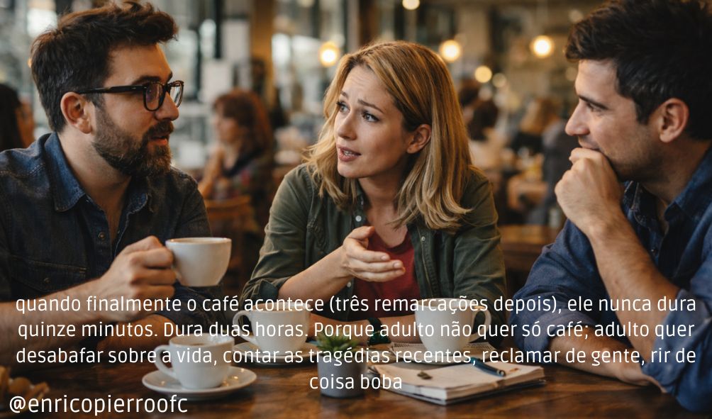 E ainda tem o detalhe: quando finalmente o café acontece (três remarcações depois), ele nunca dura quinze minutos. Dura duas horas. Porque adulto não quer só café; adulto quer desabafar sobre a vida, contar as tragédias recentes, reclamar de gente, rir de coisa boba, pedir conselho que não vai seguir e fazer análises profundas que desaparecerão completamente da memória assim que chegar em casa.