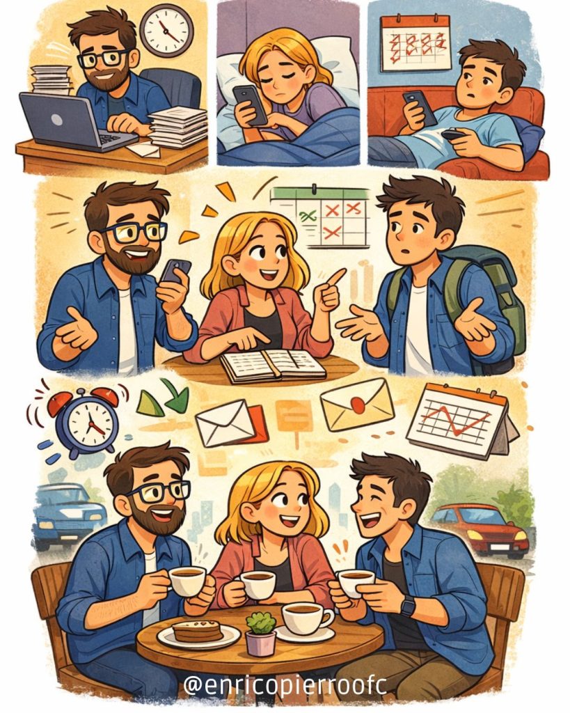 E é por isso que marcar um café na vida adulta não é só um encontro: é uma vitória. Quase um ato de resistência. Um pequeno milagre de agendas alinhadas, força emocional temporariamente restaurada e vontade de existir no mesmo horário e no mesmo lugar.