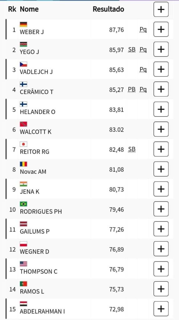 O melhor atleta da bateria de Pedro foi o alemão Julian Weber, que lançou 87,76 metros. Em seguida vem o queniano Júlio Yego, com 85, 97 metros, seguido pelo tcheco Jakub Vadlejch, com 85,63 metros.