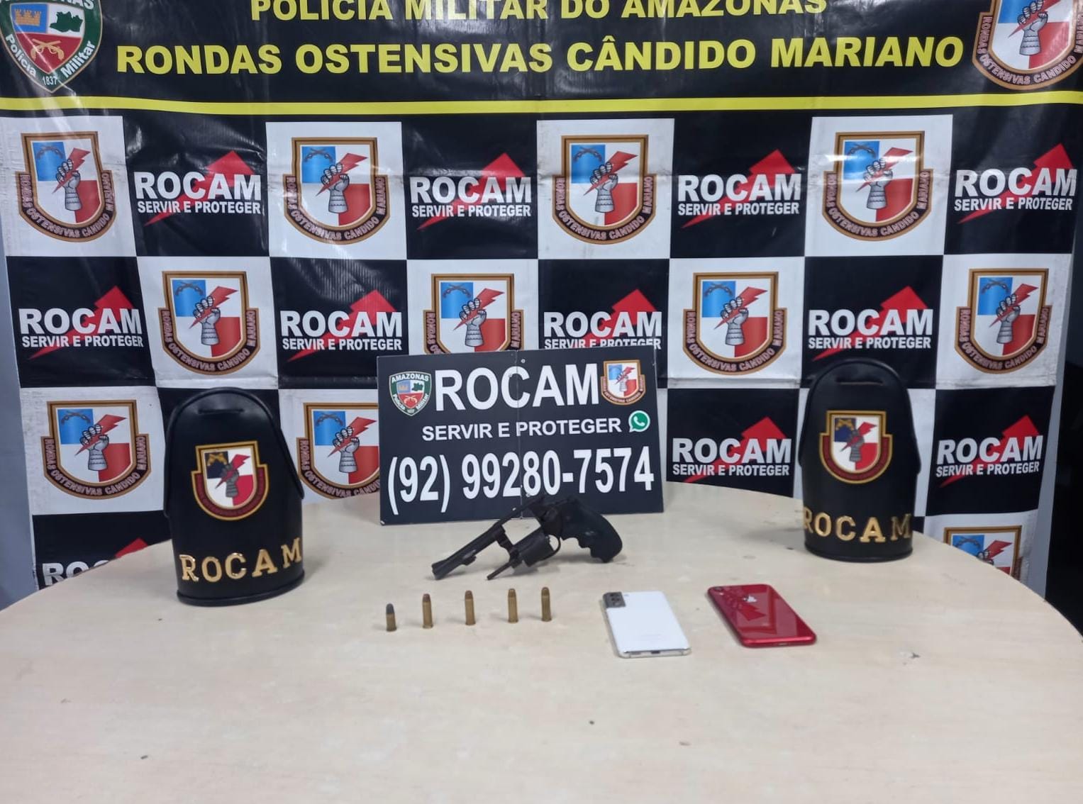 Na primeira ação, os policiais militares da das Rondas Ostensivas Cândido Mariano (Rocam) prenderam dois homens, de 24 e 28 anos, no bairro Grande Vitória, zona leste. Com eles foi apreendido um revólver calibre 28, dois aparelhos celulares e cinco munições calibre 38.