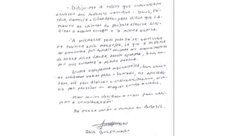 A autenticidade da carta foi confirmada pela assessoria do senador Flávio Bolsonaro (PL), filho do ex-presidente.