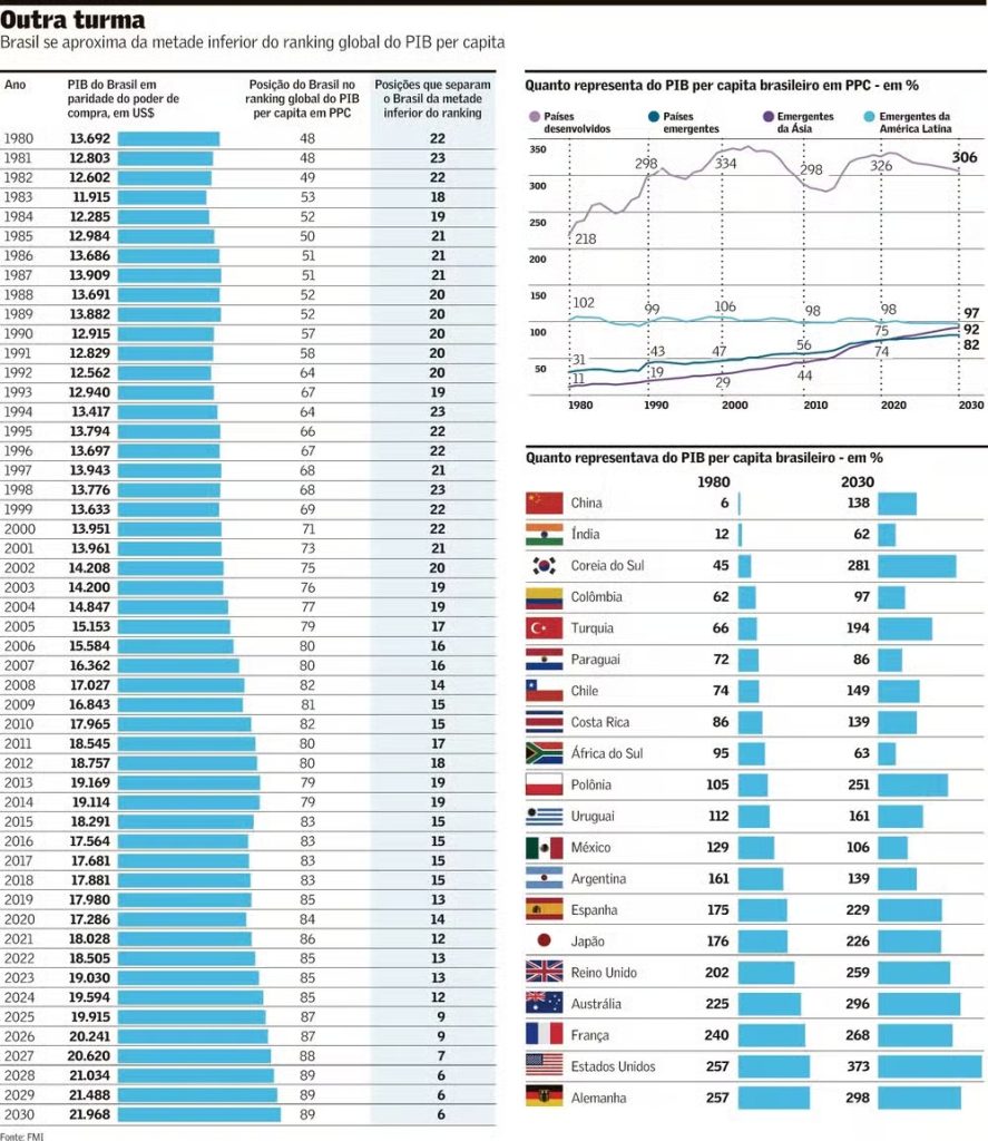 Além da queda no ranking geral, o país também vem sendo ultrapassado por seus pares econômicos. Em 1980, o PIB per capita médio dos países emergentes representava apenas 31% do brasileiro. Hoje, essa proporção já chega a 78%, e deve alcançar 82% até 2030, conforme as projeções do FMI.