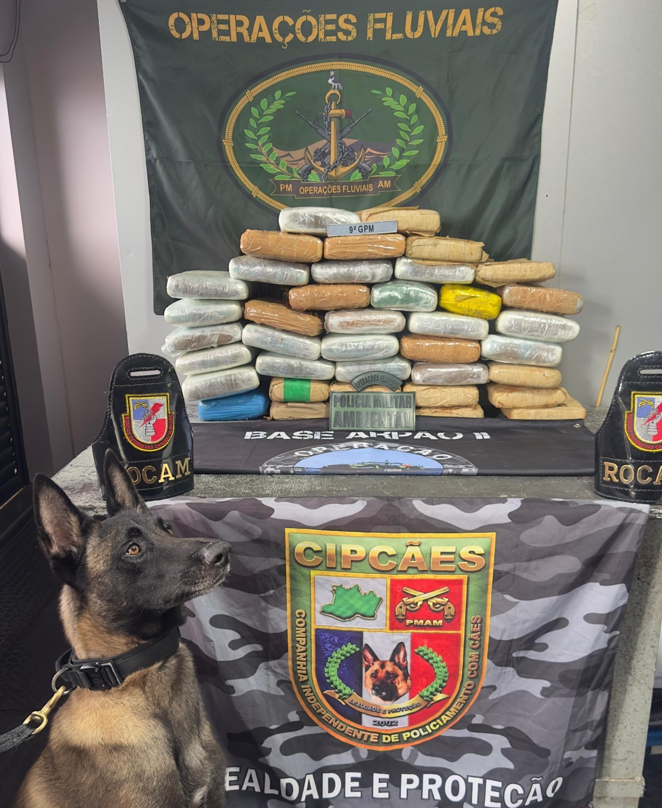 Durante a vistoria, coordenada pela Secretaria de Segurança Pública do Amazonas (SSP-AM), o cão farejador indicou a presença de entorpecentes em três malas. Ao abrirem o material, os policiais encontraram 39 tabletes de droga.