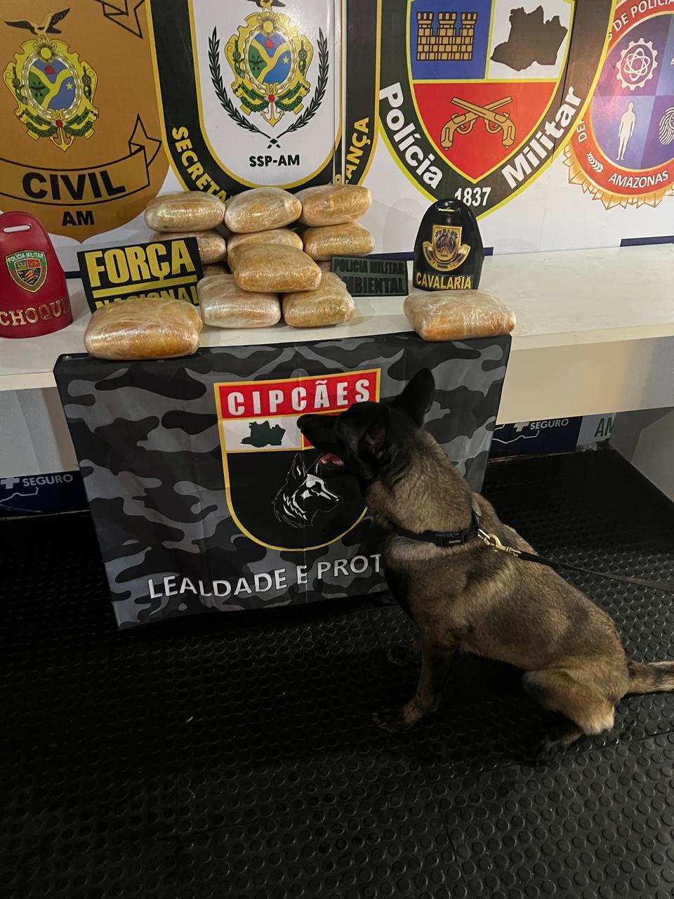 A ação ocorreu durante patrulhamento fluvial realizado por policiais da base, com apoio da cadela farejadora Athena, da Companhia Independente de Policiamento com Cães (CipCães). O barco Estrela do Purus, que havia partido do município de Tefé, foi interceptado e, durante a revista, os agentes encontraram cerca de 14 tabletes de maconha escondidos em duas malas.