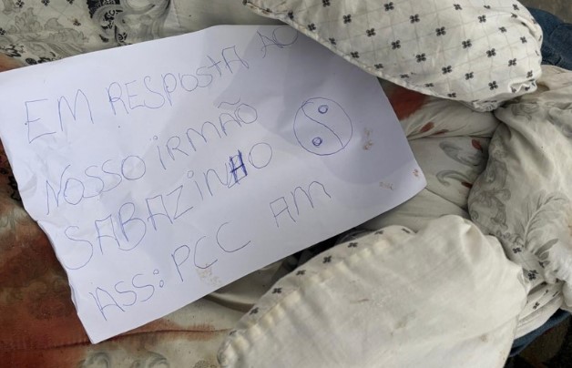 De acordo com informações, o corpo foi encontrado por moradores da área que saiam para trabalhar. As partes do corpo foram divididas em duas partes e enroladas em lençol. Ao lado de uma das partes, a facção criminosa deixou um bilhete atribuindo a execução do homem a morte de um homem identificado como Sabazinho. “Em resposta ao nosso irmão Sabazinho”, diz o bilhete.