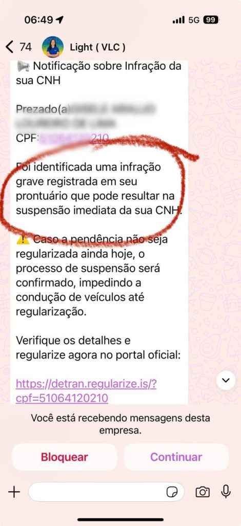 O Departamento Estadual de Trânsito do Amazonas (Detran-AM) emitiu um alerta à população sobre um novo golpe aplicado por meio do WhatsApp, no qual criminosos se passam por servidores do órgão para notificar supostas infrações de trânsito e a suspensão da Carteira Nacional de Habilitação (CNH), exigindo pagamentos indevidos via Pix.