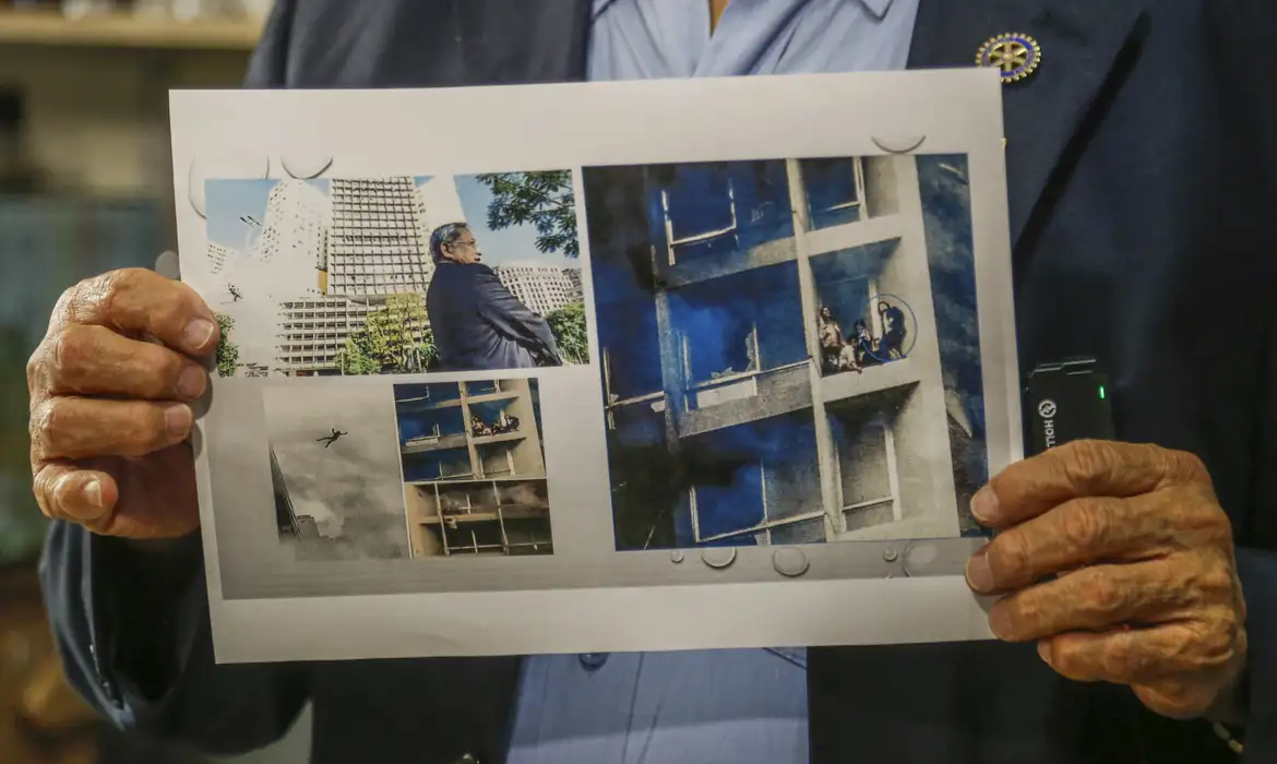 “Na hora exata do incêndio, eu estava na sala do meu diretor, no 22º andar. Nessa sala tem um banheiro privativo. Estávamos eu, ele e uma secretária preparando a apresentação, quando escutamos uma barulhada de vidros explodindo. Meu chefe pegou um extintor e saiu correndo. A secretária foi atrás dele. Eu estava correndo atrás deles, mas lembrei que tinha esquecido minha caneta [que havia ganhado do pai] e voltei. Peguei a caneta, minha mala e meu paletó. Quando fui sair de novo, alguns segundos depois, o hall dos elevadores e a escada já haviam virado uma chaminé. Tentei subir ou descer pela escada, mas não consegui e acabei voltando para a sala onde estava. Nesse meio tempo, seis pessoas apareceram por ali. O Hiroshi era uma delas”, contou.