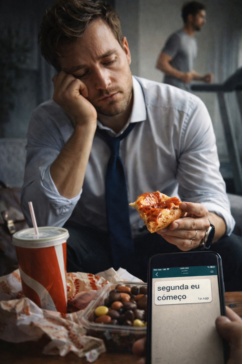 Na terça, às 14h, você já está comendo um doce proibido, ignorando notificações do aplicativo e prometendo: “semana que vem eu começo mesmo!”. Essa parte é importante: nunca desistir da mentira. Ela sustenta nossa esperança.