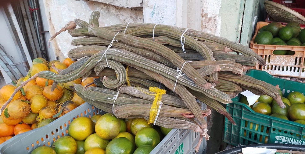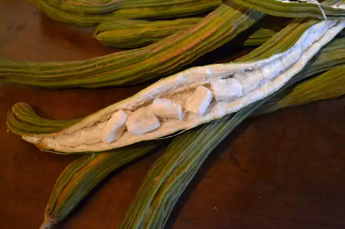 - Frutos longos, em forma de vagem, que podem ultrapassar 50 centímetros;