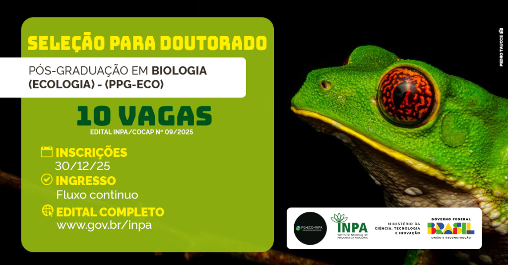 Manaus – O Instituto Nacional de Pesquisas da Amazônia (Inpa/MCTI) está com inscrições abertas, em fluxo contínuo, para o processo seletivo do curso de doutorado em Biologia (Ecologia), por meio do Programa de Pós-Graduação em Ecologia (PPG-ECO). O edital INPA/COCAP nº 09/2025 oferece inicialmente 10 vagas, com possibilidade de ampliação e previsão de bolsas para os aprovados.