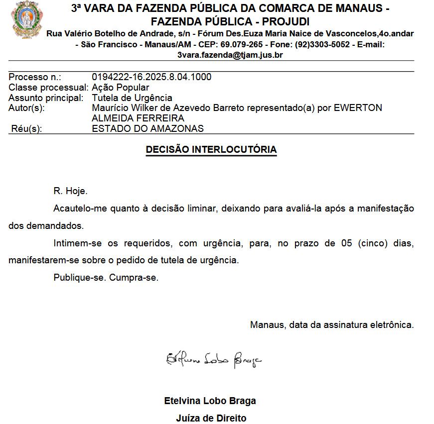 O contrato chegou a ser suspenso pelo Tribunal de Contas do Estado (TCE-AM), mas a decisão foi revertida por liminar judicial, sem que o mérito das supostas irregularidades fosse analisado. Para o deputado, a determinação da juíza representa um avanço para que o caso seja discutido de forma transparente.