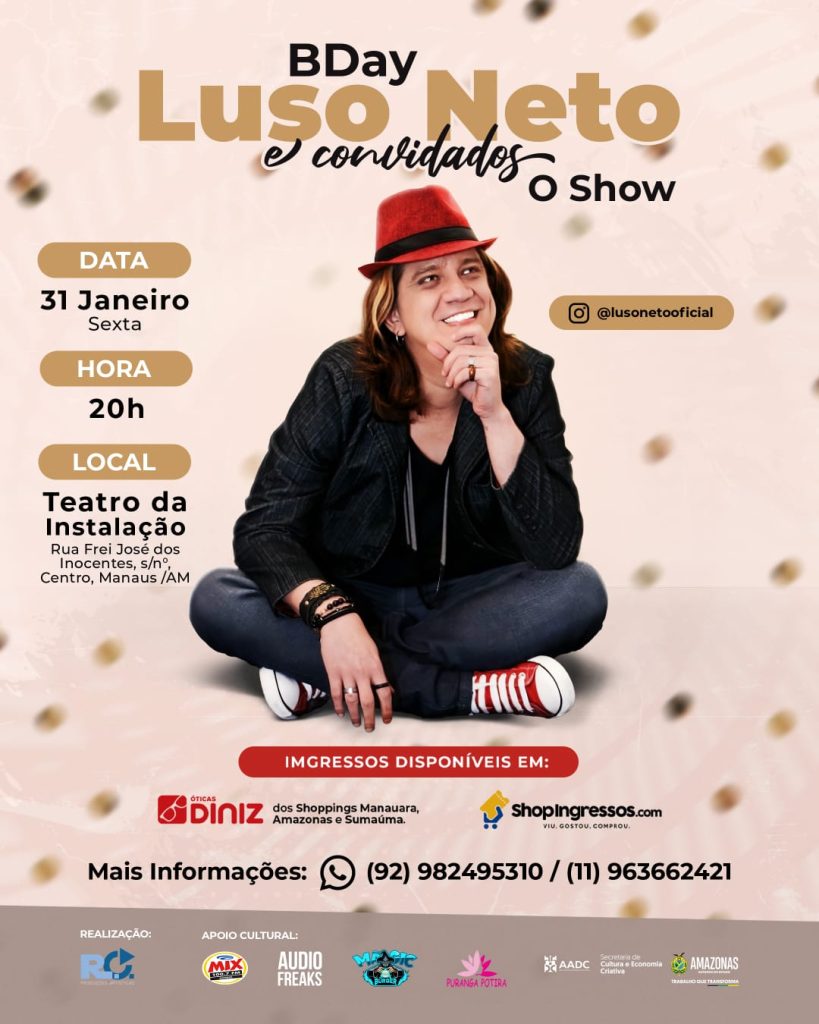 Ingressos: https://shopingressos.com.br/comprar/2434/bday-luso-e-convidados-o-show, nas Óticas Diniz dos Shoppings Amazonas, Manauara e Sumaúma e no dia do espetáculo, na portaria do Teatro.