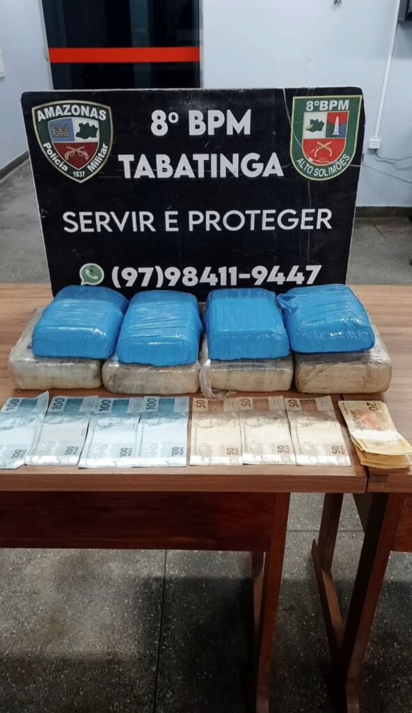 Durante os procedimentos de abordagem e busca pessoal, foi encontrada uma bolsa contendo oito tabletes de entorpecentes, sendo quatro de maconha e quatro de pasta base de cocaína. Além das drogas, foram apreendidos uma motocicleta, R$ 724 em espécie e 90 mil pesos colombianos.