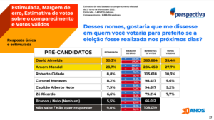 De acordo com o levantamento, Almeida alcançou 30,3% das intenções, enquanto Amom atingiu 23,7%. Os números mostram uma oscilação nas preferências, uma vez que, em março deste ano, David tinha 32% da preferência do eleitorado, subindo para 36,9% em agosto e retornando ao patamar de 31,9% em outubro. Atualmente, o prefeito detém 30,3% das intenções de voto, com margem de erro de 3,1%, o que poderia elevar-se para 33,4%.