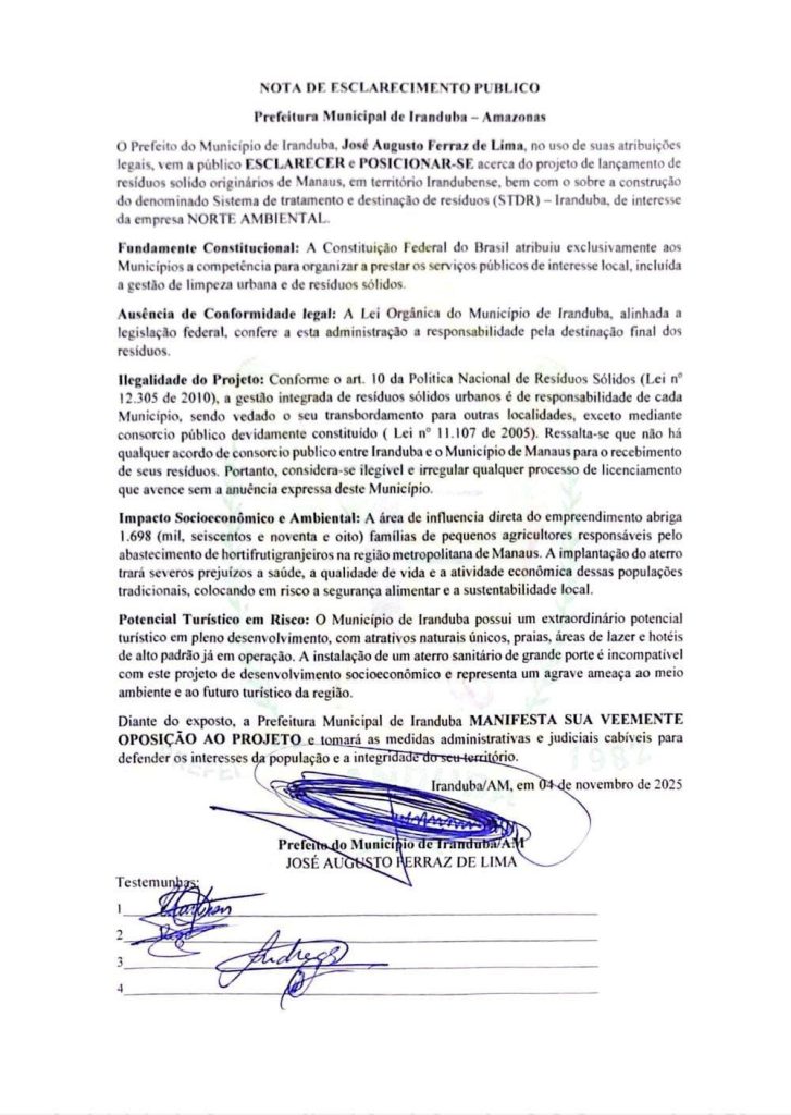 A Prefeitura Municipal de Iranduba divulgou nesta terça-feira (04/10) uma nota pública reforçando sua posição contrária ao projeto de instalação de um aterro sanitário destinado ao recebimento de resíduos sólidos no município. O empreendimento seria de responsabilidade da empresa Norte Ambiental, sob o nome de Sistema de Tratamento e Destinação de Resíduos (STDR).