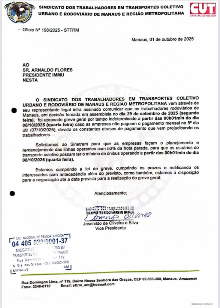 Cumprindo o que determina a Lei de Greve, o STTRCUR notificou o Sindicato das Empresas de Transporte de Passageiros do Estado do Amazonas (Sinetram), solicitando o planejamento e remanejamento das linhas para garantir a circulação de pelo menos 50% da frota a partir do início da paralisação. O objetivo é reduzir o impacto sobre os usuários que dependem do transporte coletivo na capital e na região metropolitana.