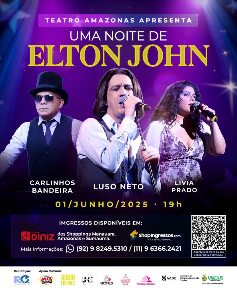 Teatro Amazonas recebe “Uma Noite de Elton John” neste domingo (1º), com Luso Neto, Lívia Prado e Carlinhos Bandeira