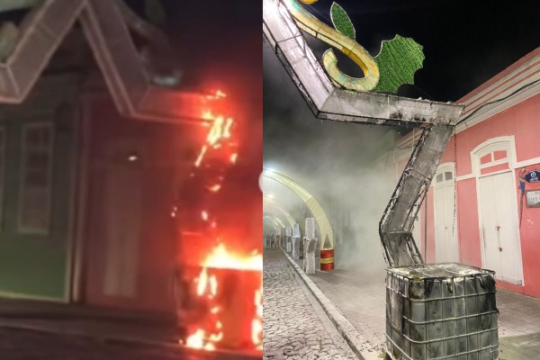 Vandalismo: parte do portal natalino na rua Bernardo Ramos é incendiado