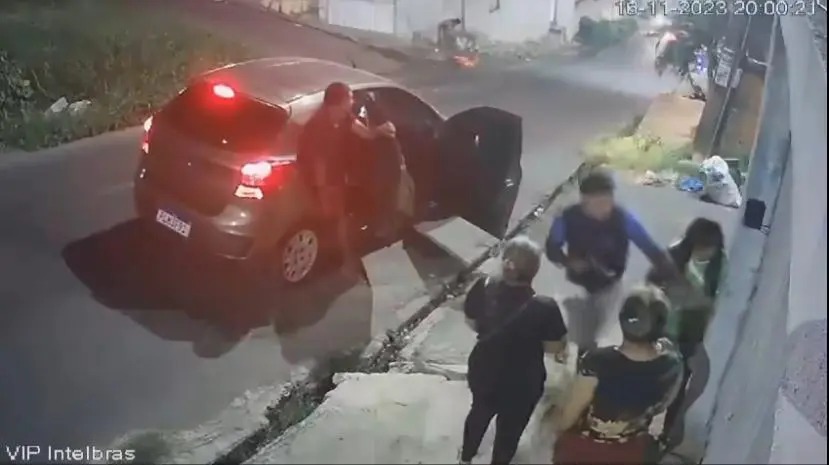 Nas imagens é possível ver o momento em que mulheres estão na frente de uma casa quando são abordadas por criminosos que chegam em um carro modelo Ford KA cinza.